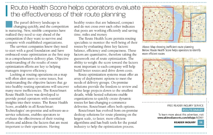 Looking at routing operations on a map will often alert users to some issues, but understanding the objective factors that go into healthy routing operations will uncover many more inefficiencies. The RouteSmart Route Health Score was developed to provide postal operators with essential insights into their routes. The Route Health Score, available in all RouteSmart Technologies’ on-premise and software as-a-service solutions, enables operators to evaluate the effectiveness of their routing efforts and address the factors that are most important to their operations. Having healthy routes that are balanced, compact and do not cross over each other indicates that posts are working efficiently and saving time, miles and money.